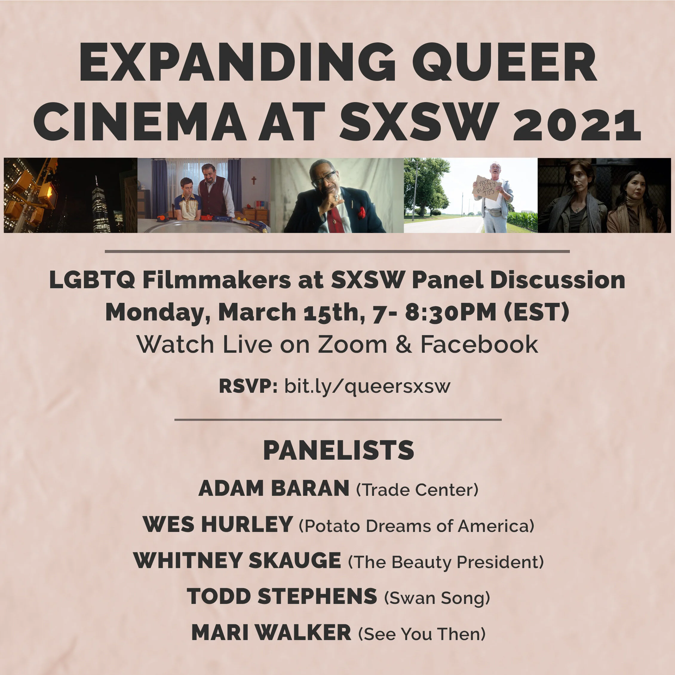On Monday March 15th at 7PM, join a live Zoom panel discussion featuring LGBTQ filmmakers premiering new films at the 2021 virtual edition of the SXSW Film Festival. Panelists will discuss how they brought their films to life, the challenges they face as queer filmmakers in the current indie cinema landscape, and how to sustain a career as an LGBTQ filmmaker. Find out how these filmmakers are continuing to push the queer canon to be more representative and the lessons (and comfort) their unique visions offer audiences during these very interesting times. Panelists: Adam Baran (Trade Center), Wes Hurley (Potato Dreams of America), Whitney Skauge (The Beauty President), Todd Stephens (Swan Song), Mari Walker (See You Then)